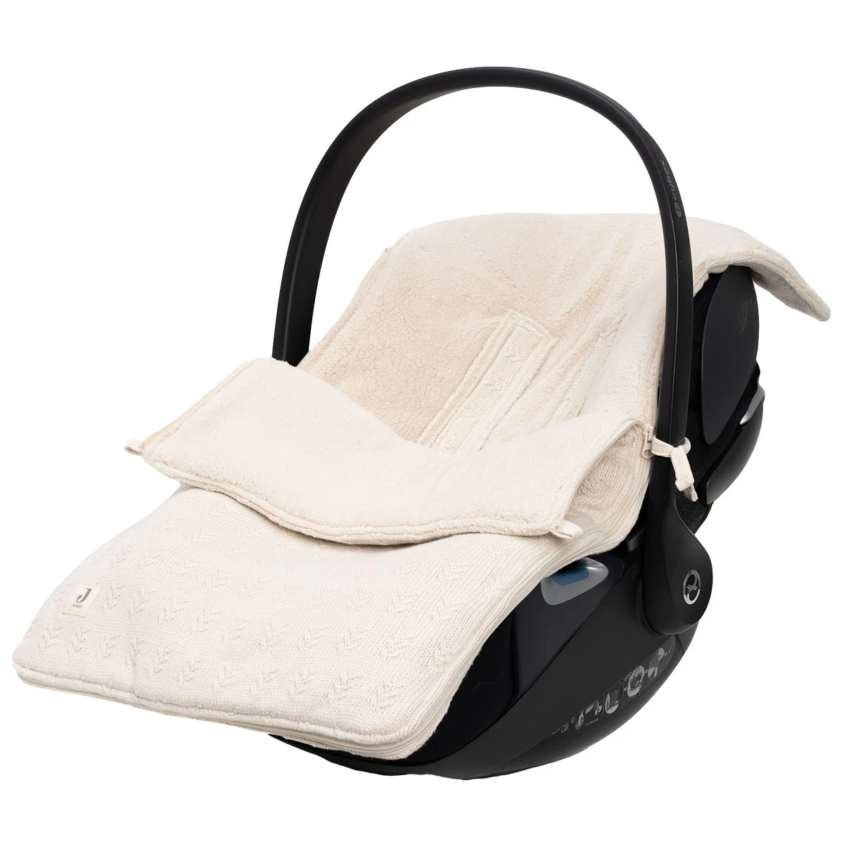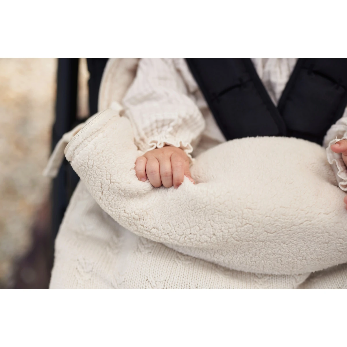 De voetenzak is geschikt voor gebruik in een groep 0 autostoeltje met 3- of 5-punts veiligheidsgordel.